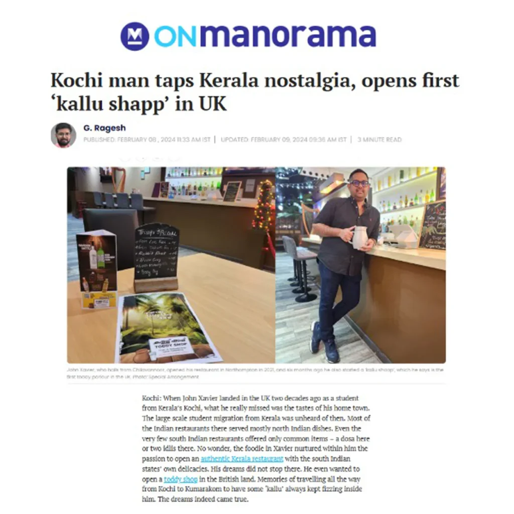 Northampton chef first to bring palm Toddy to UK. John Xavier from Thattukada restaurant describes his love for Keralan palm Toddy…